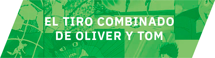 Oliver y Tom golpean con fuerza y gran precisión el balón al mismo tiempo, uno con el pie izquierdo y el otro con el pie derecho. De este modo, le imprimen al esférico una trayectoria que el portero no logra interceptar.